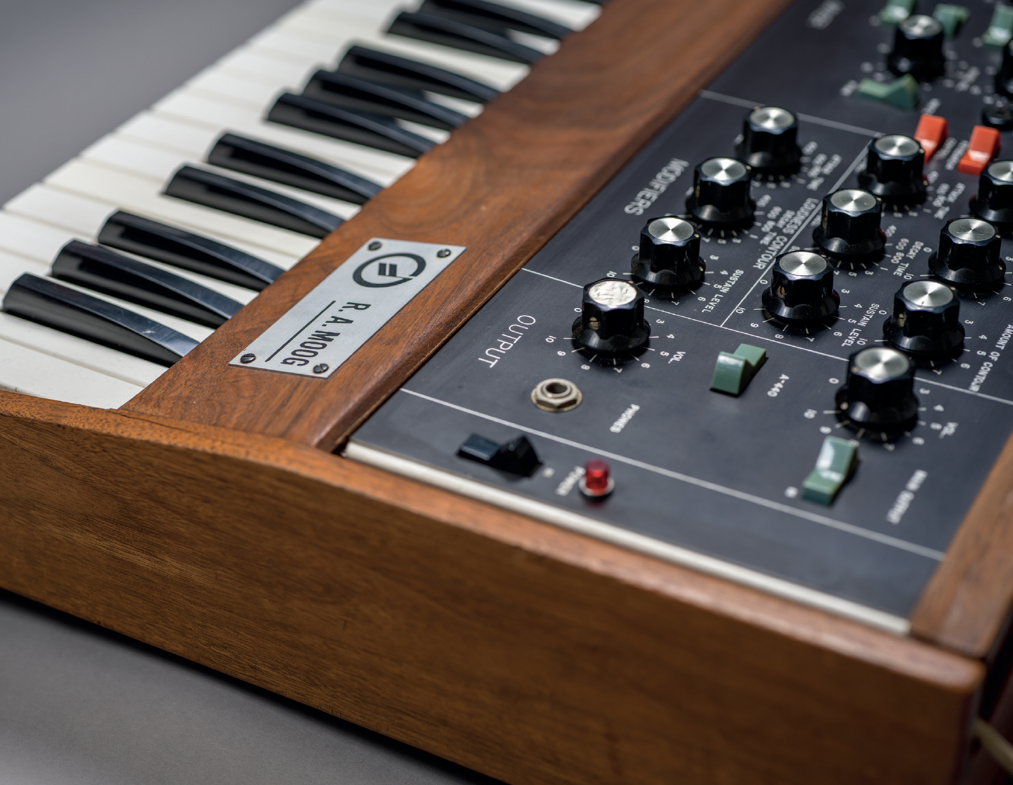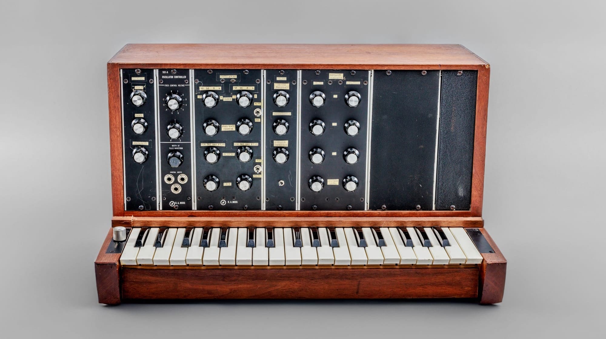 Bill dubbed his creation the Min, even having a small nameplate made that read “Min Synthesizer Model A, R. A. Moog, Inc., Trumanburg, N.Y.” (sic). Holding just five Moog modules, this miniaturized take on a full modular system almost resembled a child’s piano. Its three-octave keyboard was bolted to the vertical case, marking the first time in the company’s history that an instrument was completely self-contained. Small pieces of paper with typewritten labels were taped above and around the controls to show what each knob did.